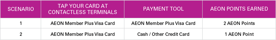 You will be rewarded with 2x AEON Points for shopping at AEON Stores, AEON BiG Hypermarkets, AEON MaxValu Prime and AEON Wellness. Just present your valid AEON Member Plus Visa Card before scanning your purchase items and use it as a payment tool instead of cash. For every Ringgit spent, you will be entitled to two (2) AEON points.