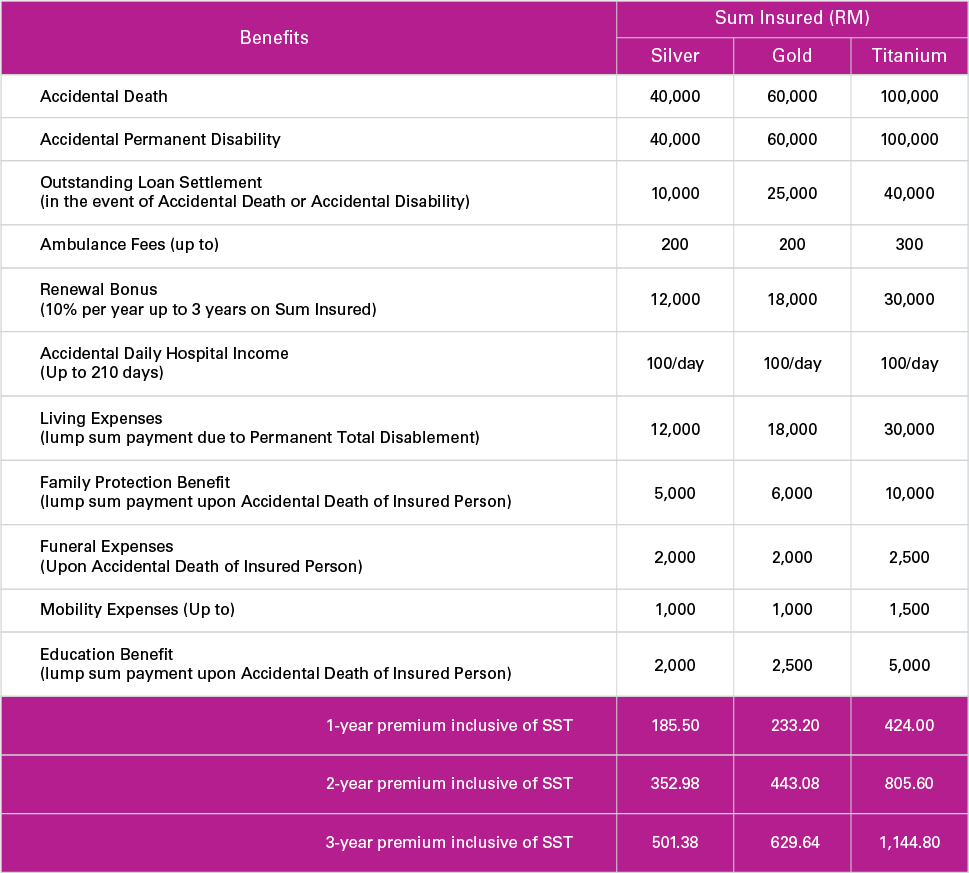 With Smartcare Plus, you will be able to settle your outstanding loan and provide your family the funds it will need in the event of a permanent total disability or demise from an accident
