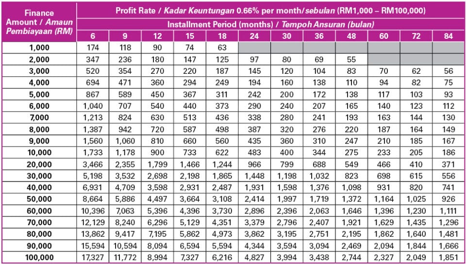 Table of Profit Rate/Kadar Keuntungan 0.66% per month/sebulan (RM1,000 – RM100,000)