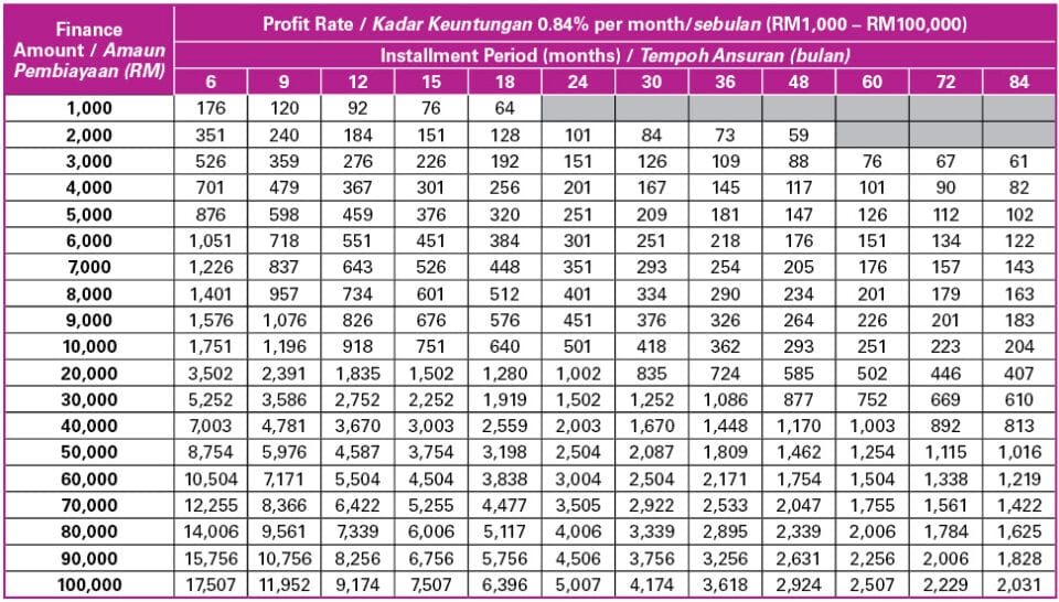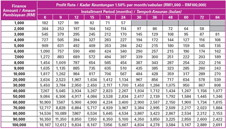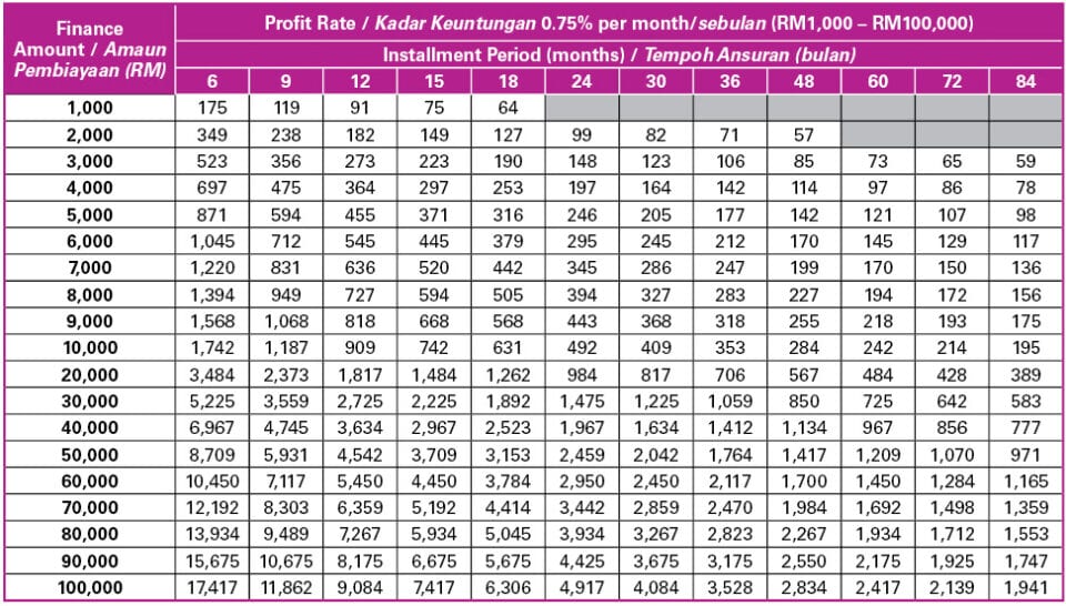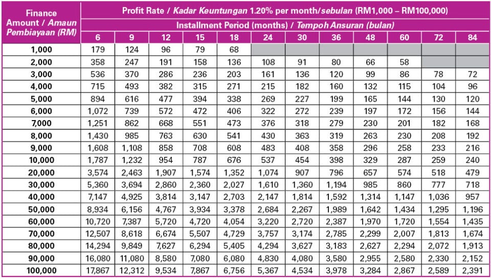 Instalment tables to guide you for your personal financing (from RM1,000 to RM100,000).